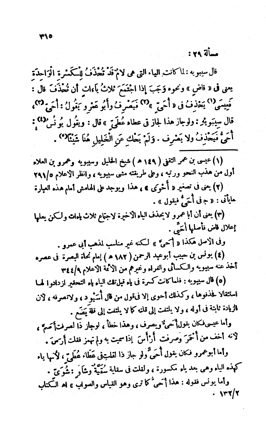 قال سيبويه: لما كانت الياء التي هي لام قد تحذف للكسرة الواحدة يعني في "قاضٍ" ونحوه وجب إذا اجتمع ثلاث ياءاتٍ أن تحذف قال: فعيسى يحذف في "أحىٍ" فيصرف وأبو عمرو يقول: أحى، قال سيبويه: ولو جاز هذا لجاز في عطاء عطىٍ" قال: ويقول يونس: أحى فيحذف ولا يصرف. ولم يحك عن الخليل هنا شيئًا.