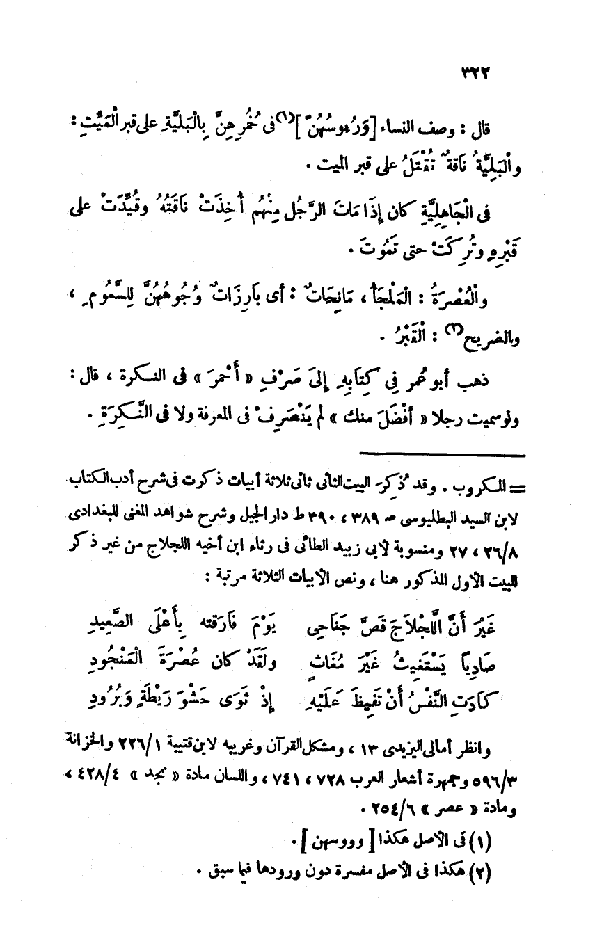 قال: وصف النساء [ورءوسهن] في خمرهن بالبلية على قبر الميت: والبلية ناقة تقتل على قبر الميت.