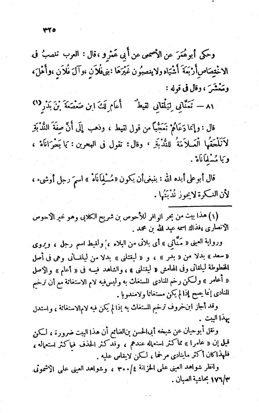 وحكى أبو عمر عن الأصمعي عن أبي عمروٍ، قال: العرب تنصب في الاختصاص أربعة أشياء ولا ينصبون غيرها: بني فلانٍ، وآل فلانٍ، وأهل، ومعشر، وقال في قوله: