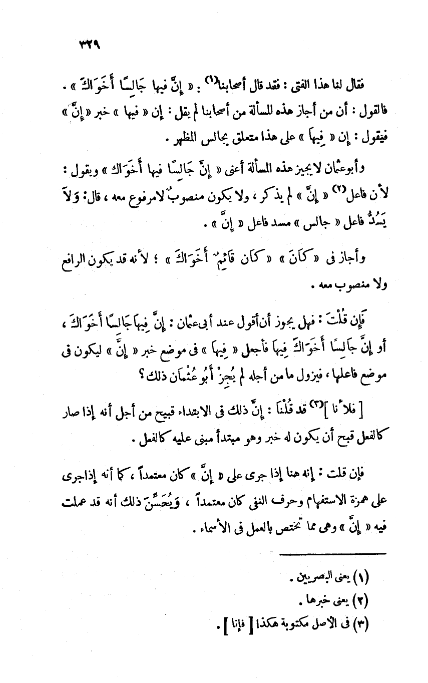 وأبو عثمان لا يجيز هذه المسألة أعني "إن جالسًا فيها أخواك" ويقول: لأن فاعل "إن" لم يذكر، ولا يكون منصوب لا مرفوع معه، قال: ولا يسد فاعل "جالس" مسد فاعل "إن".