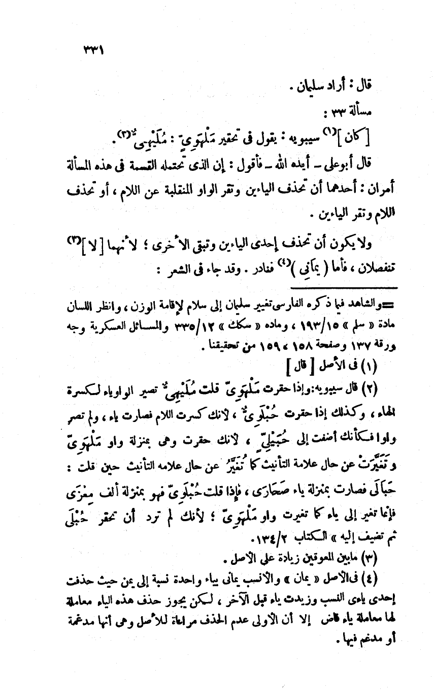 قال أبو علي -أيده الله- فأقول: إن الذي تحتمله القسمة في هذه المسألة أمران: أحدهما أن تحذف الياءين وتقر الواو المنقلبة عن اللام، أو تحذف اللام وتقر الياءين.