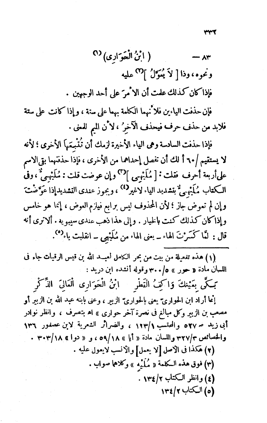 فإذا حذفت السادسة وهي الياء الأخيرة لزمك أن تتبعها الأخرى؛ لأنه لا يستقيم /60 ألك أن تفصل إحداهما من الأخرى، فإذا حذفتهما بقى الاسم على أربعة أحرف فقلت: [مليهى] وإن عوضت قلت: مليهى، وفي الكتاب مليهى بتشديد الياء لا غير، ويجوز عندي التشديد إذا عوضت وإن لم تعوض جاز؛ لأن المحذوف ليس برابع فيلزم العوض، إنما هو خامس وإذا كان كذلك كنت بالخيار. وإلى هذا ذهب عندي سيبويه. ألا ترى أنه قال: لما كسرت الهاء -يعني الهاء من مليهى- انقلبت ياء.