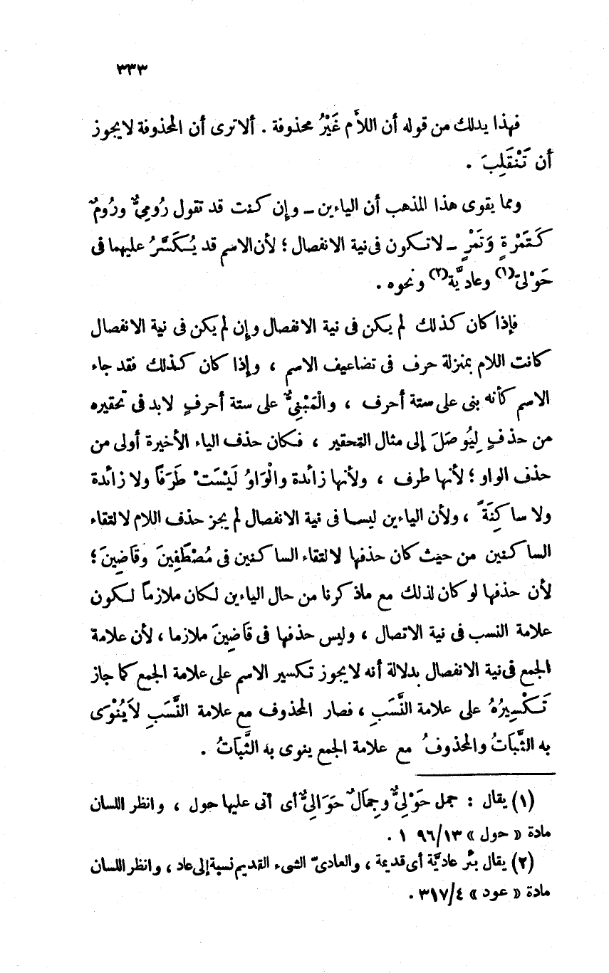 ومما يقوى هذا المذهب أن الياءين -وإن كنت قد تقول رومى وروم كتمرةٍ وتمرٍ- لا تكون في نية الانفصال؛ لأن الاسم قد يكسر عليهما في حولى وعادية ونحوه.