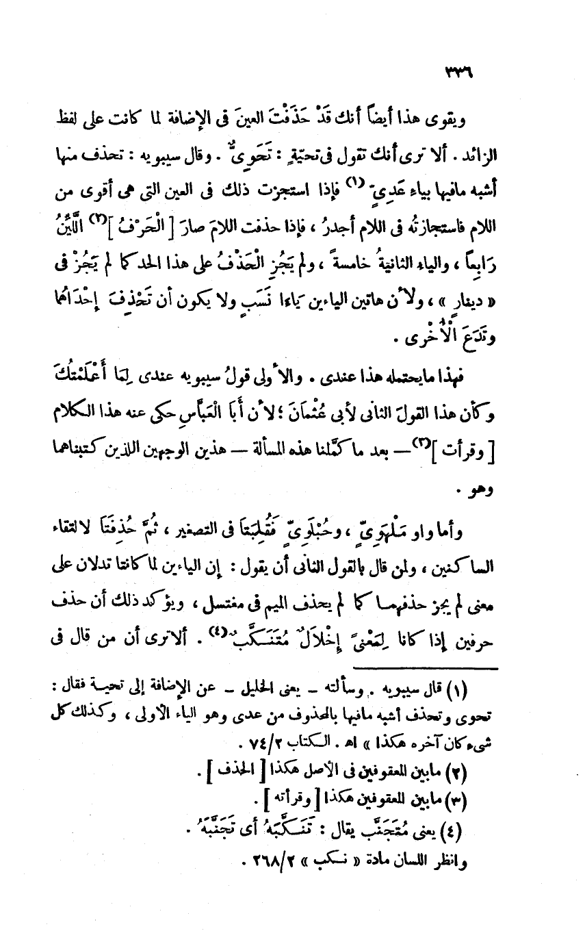 ويقوى هذا أيضًا أنك قد حذفت العين في الإضافة لما كانت على لفظ الزائد. ألا ترى أنك تقول في تحيةٍ: تحوى. وقال سيبويه: تحذف منها أشبه ما فيها بياء عدىٍ فإذا استجزت ذلك في العين التي هي أقوى من اللام فاستجازته في اللام أجدر، فإذا حذفت اللام صار [الحرف] اللين رابعًا، والياء الثانية خامسةً، ولم يجز الحذف على هذا الحد كما لم يجز في "دينار"، ولأن هاتين الياءين ياءا نسبٍ ولا يكون أن تحذف إحداهما وتدع الأخرى.
