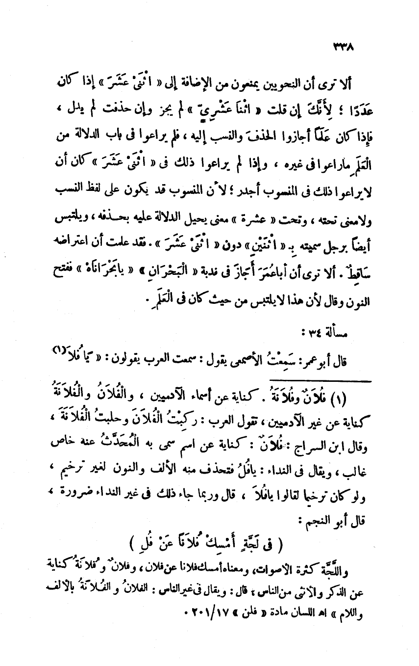 ألا ترى أن النحويين يمنعون من الإضافة إلى "اثنى عشر" إذا كان عددًا؛ لأنك إن قلت "اثنا عشرى" لم يجز وإن حذفت لم يدل، فإذا كان علمًا أجازوا الحذف والنسب إليه، فلم يراعوا في باب الدلالة من العلم ما راعوا في غيره، وإذا لم يراعوا ذلك في "اثنى عشر" كان أن لا يراعوا ذلك في المنسوب أجدر؛ لأن المنسوب قد يكون على لفظ النسب ولا معنى تحته، وتحت "عشرة" معنى يحيل الدلالة عليه بحذفه، ويلتبس أيضًا برجل سميته بـ "اثنين" دون "اثنى عشر". فقد علمت أن اعتراضه ساقط. ألا ترى أن أبا عمر أجاز في ندبة "البحران" "يا بحراناه" ففتح النون وقال لأن هذا لا يلتبس من حيث كان في العلم.