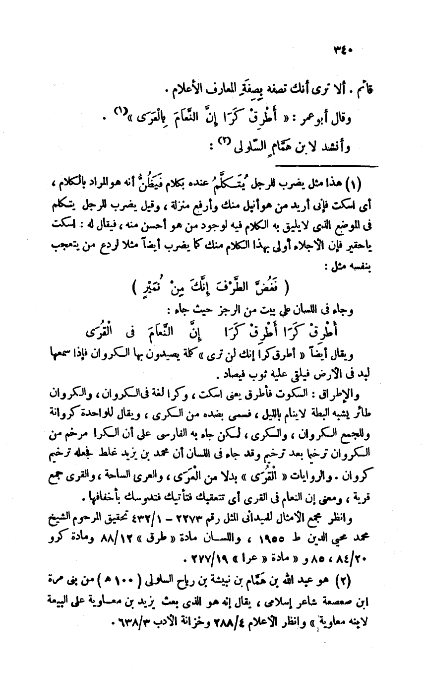 وقال أبو عمر: "أطرق كرا إن النعام بالعرى".