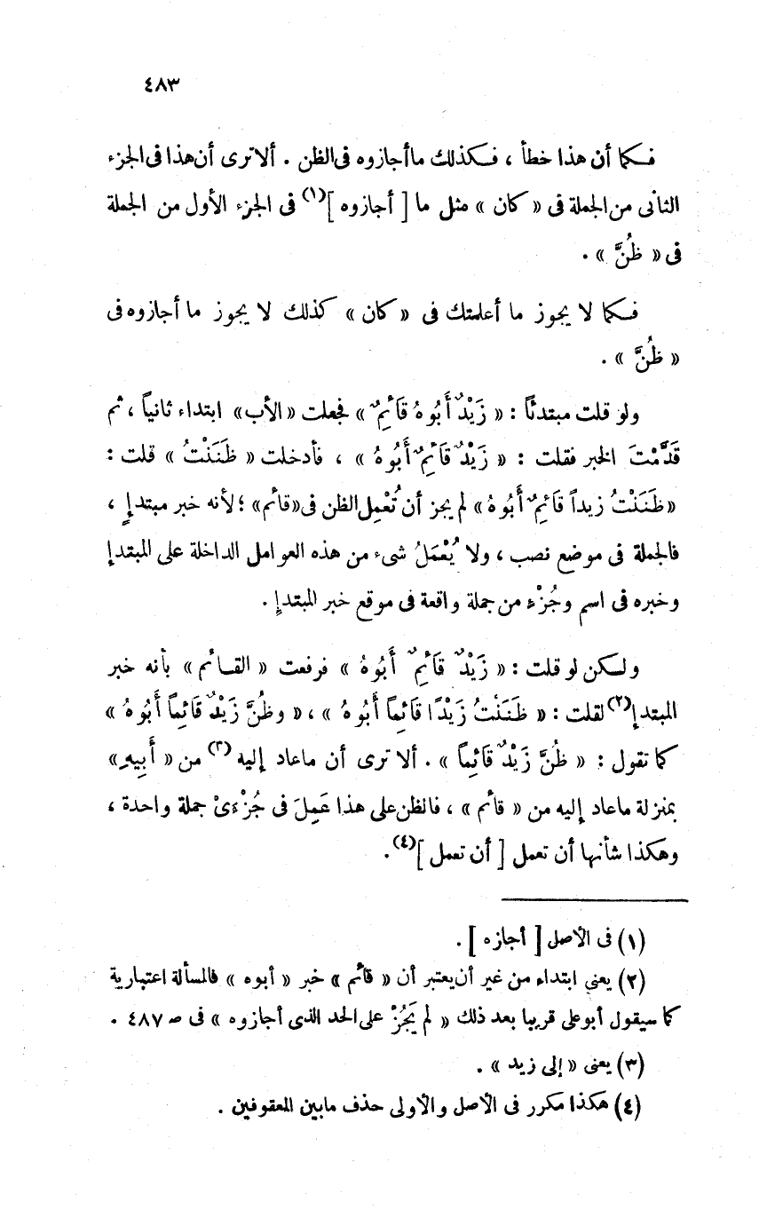 ولكن لو قلت: "زيدٌ قائمٌ أبوه" فرفعت "القائم" بأنه خبر المبتدإ لقلت: "ظننتُ زيداً قائماً أبوهُ"، "وظُنَّ زيدٌ قائماً أبوه" كما تقول: "ظُنَّ زيدٌ قائماً". ألا ترى أن ما عاد إليه من "أبيه" بمنزلة ما عاد إليه من "قائم"، فالظن على هذا عَمِلَ في جزءَي جملة واحدة، وهكذا شأنها أن تعمل [أن تعمل].