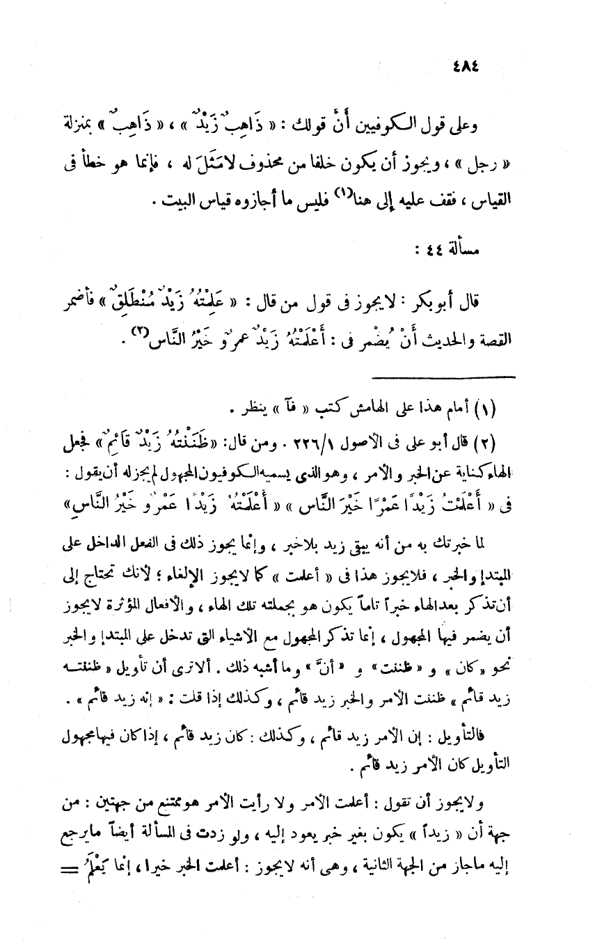 قال أبو بكر: لا يجوز في قول من قال: "عَلِمتُهُ زيدٌ منطلقٌ" فأضمر القصة والحديث أن يُضمر في: أعلمتهُ زيدٌ عمروٌ خيرُ الناس.