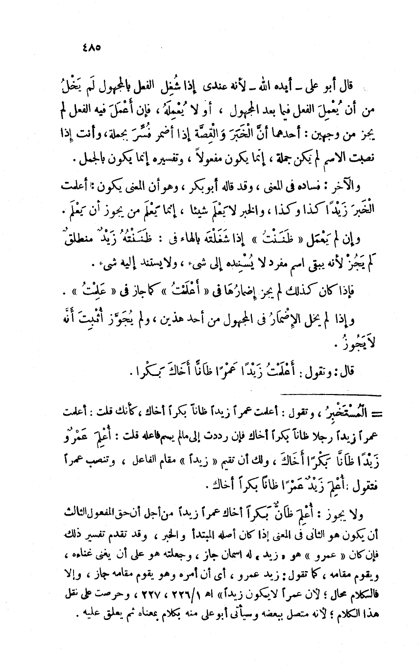 قال أبو علي - أيده الله- لأنه عندي إذا شُغل الفعل بالمجهول لم يخلُ من أن يُعمِلَ الفعل فيما بعد المجهول، أو لا يُعمِلَه، فإن أعمل فيه الفعل لم يجز من وجهين: أحدهما أن الخبر والقصة إذا أضمر فُِّر بجملة، وانت إذا نصبت الاسم لم يكن جملة، إنما يكون مفعولاً، وتفسيره إنما يكون بالجمل.