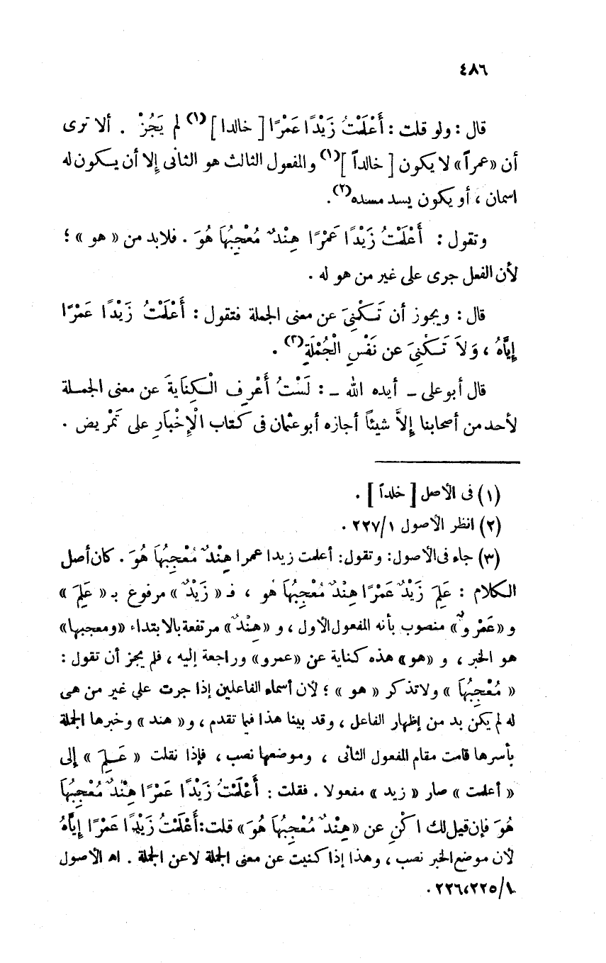 قال: ويجوز أن تَكنْيَ عن معنى الجملة فتقول: أعلَمتُ زيداً عمراً إياهُ، ولا تكْنِيَ عن نفسِ الجملةِ.
