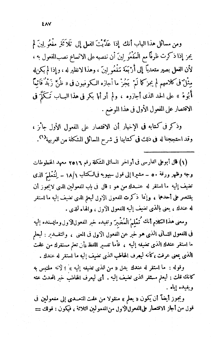 وذكر في كتابه في الإخبار أن الاقتصار على المفعول الأول جائز، وقد احتججنا له في ذلك في كتابنا في شرح المسائل المشكلة من العربية.