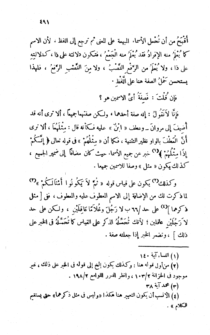 وكذلك يكون على قياس قوله "ثمَّ لا يكونوا أمثالكم" لما ذكرت لك من الإضافة إلى الاسم المعطوف عليه والمعطوف، ففي [مثل ذكرهما] على حد/ 66 ب لا رَجُل وغلاماً عاقلين، ولكن على حد لا رَجُلينِ عاقلين؛ لأنك تُحمِّلُهُ الذكر على القياس كما تُحمله في الخبر على ذلك]، وتضمر الخبر إذا جعلته صفة.