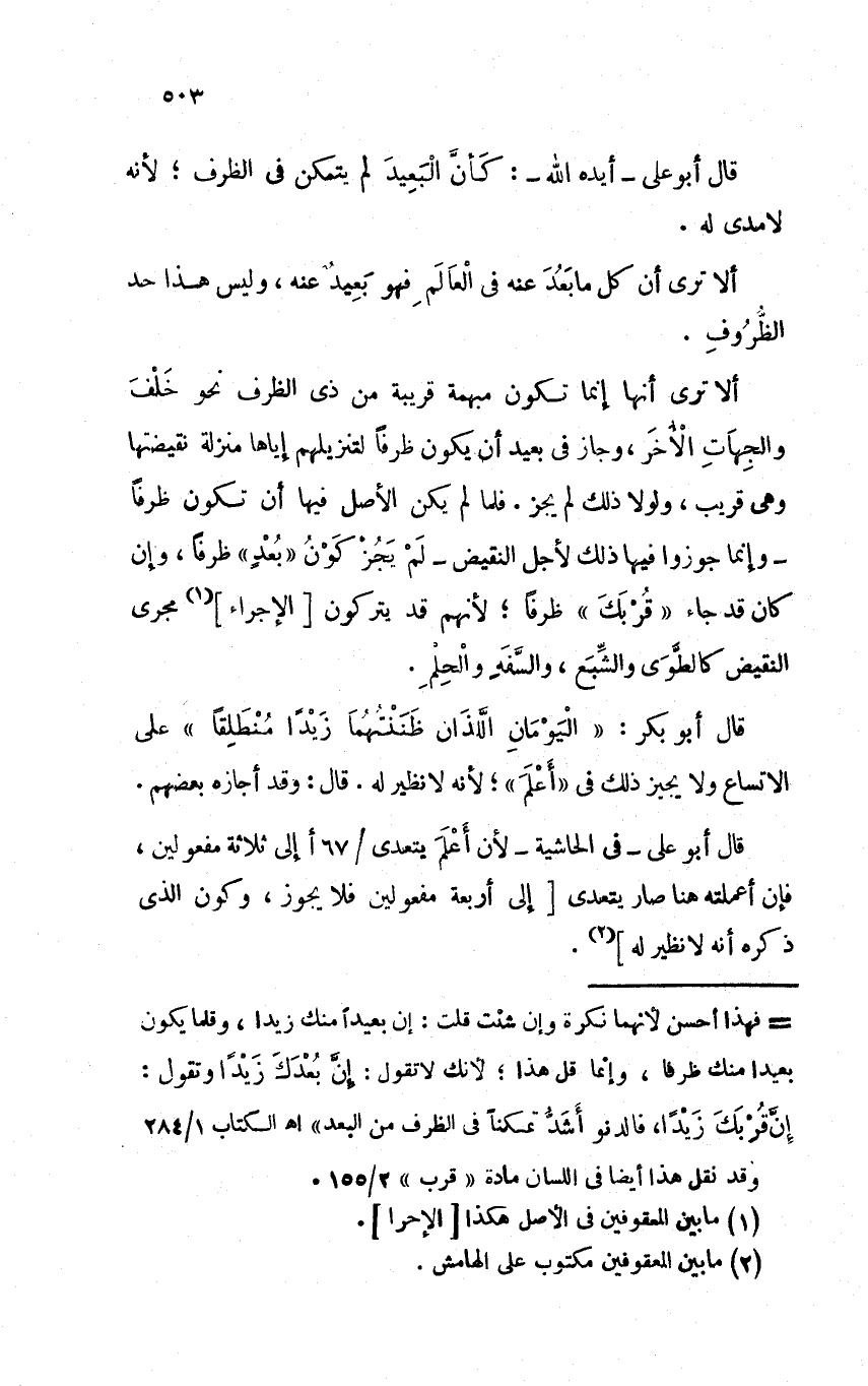 قال أبو علي -أيده الله-: كأن البعيد لم يتمكن في الظرف؛ لأنه لا مدى له.