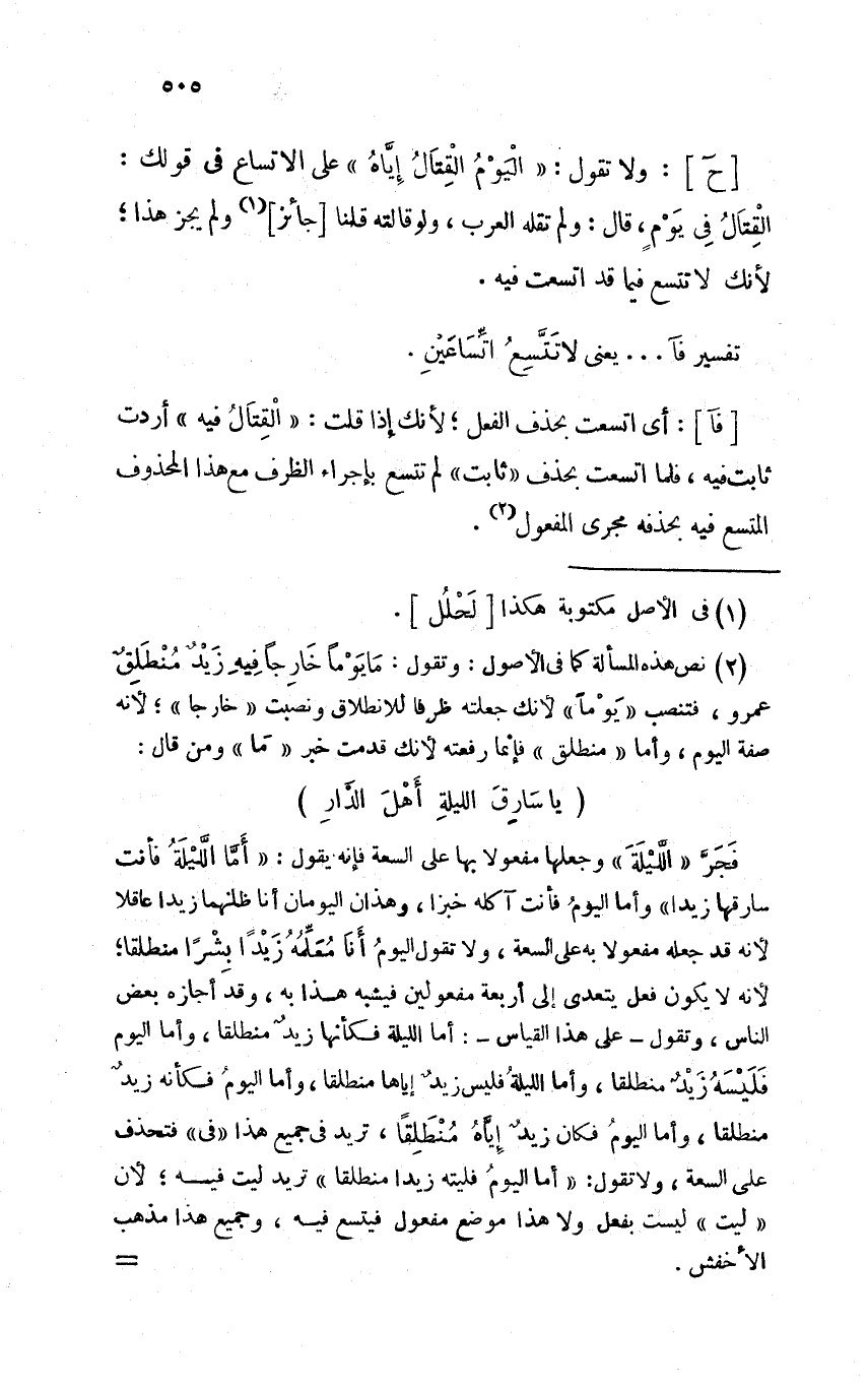 [ح~]: ولا تقول: "اليوم القتال إياه" على الاتساع في قولك: القتال في يومٍ، قال: ولم تقله العرب، ولو قالته قلنا [جائز] ولم يجز هذا؛ لأنك لا تتسع فيما قد اتسعت فيه.