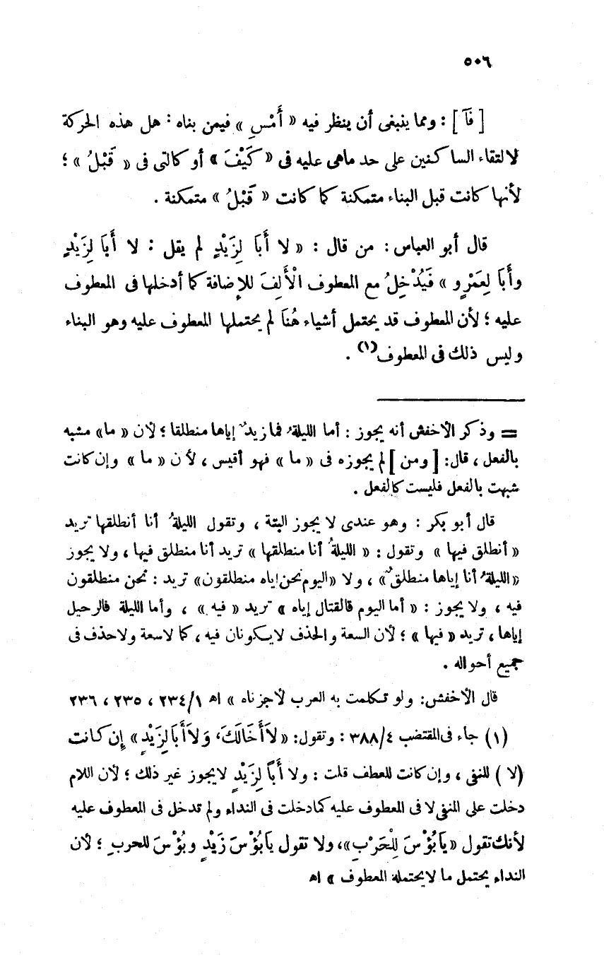 قال أبو العباس: من قال: "لا أبا لزيدٍ لم يقل: لا أبا لزيدٍ وأبا لعمروٍ" فيدخل مع المعطوف الألف للإضافة كما أدخلها المعطوف عليه؛ لأن المعطوف قد يحتمل أشياء هنا لم يحتملها المعطوف عليه وهو البناء وليس ذلك في المعطوف.