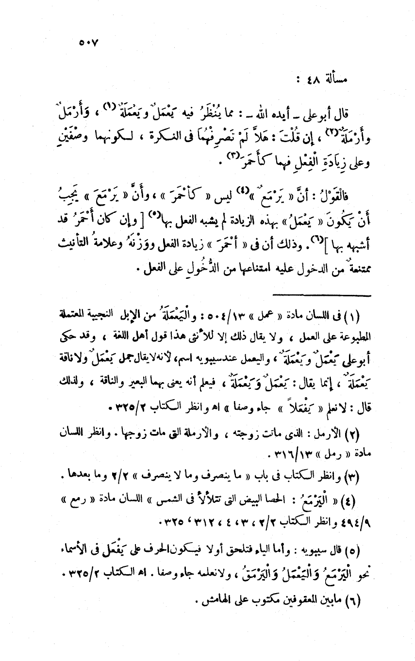 قال أبو علي -أيده الله-: مما ينظر فيه يعمل ويعملة، وأرمل وأرملة، إن قلت: هلا لم تصرفهما في النكرة، لكونهما وصفين وعلى زيادة الفعل فهما كأحمر.