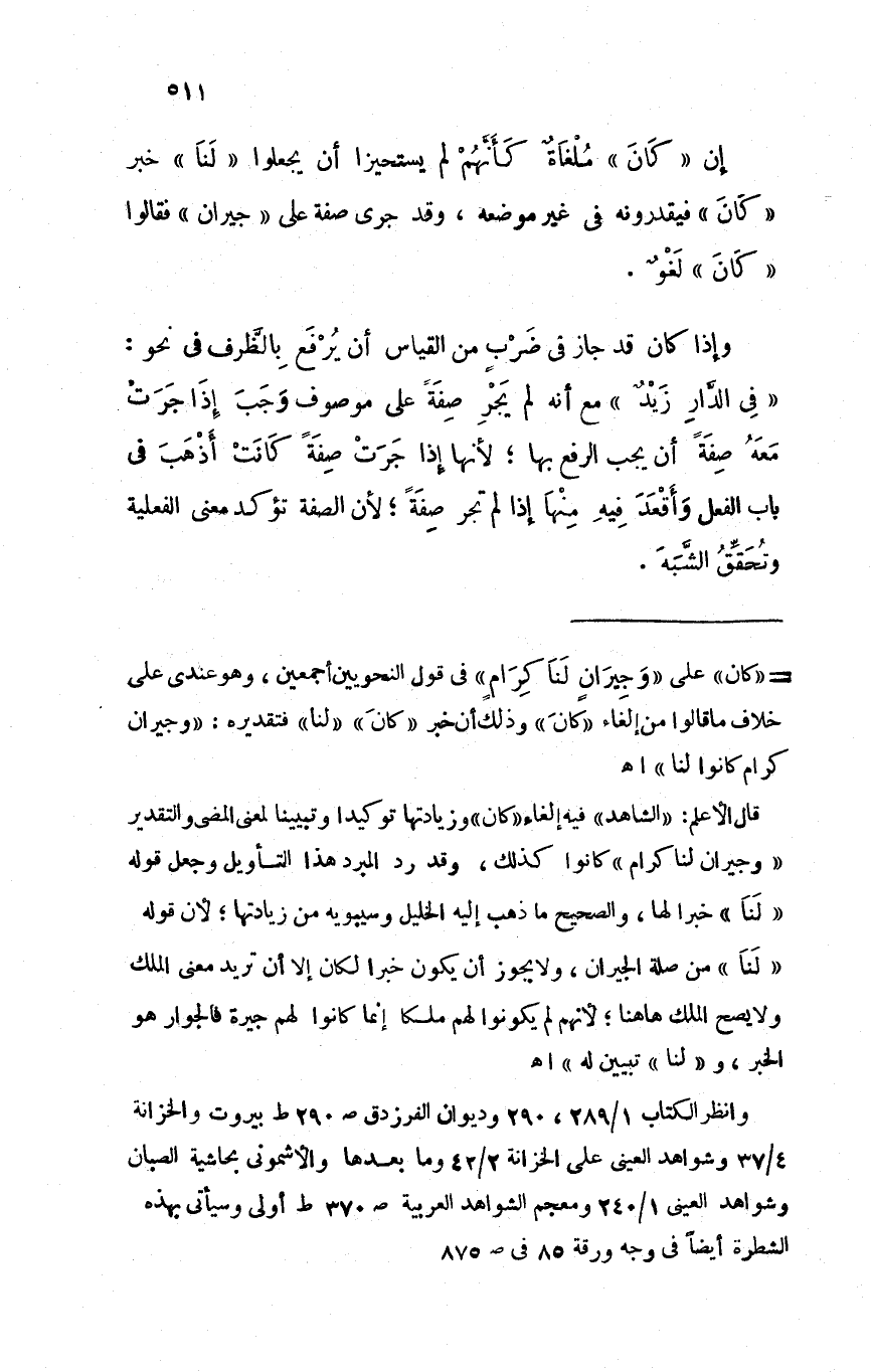 إن "كان" ملغاة كأنهم لم يستحيزا أن يجعلوا "لنا" خبر "كان" فيقدرونه في غير موضعه، وقد جرى صفة على "جيران" فقالوا "كان" لغو.