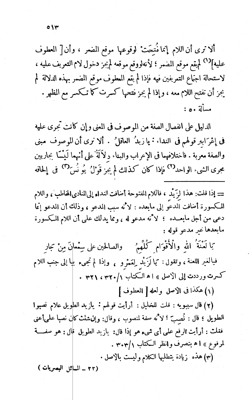 الدليل على انفصال الصفة من الموصوف في المعنى وإن كانت تجري عليه في إعرابه قولهم في النداء: يا زيد العاقل. ألا ترى أن الموصوف مبني والصفة معربة. فاختلافهما في الإعراب والبناء دلالة على أنهما ليسا بجاريين مجرى الشيء الواحد فإذا كان كذلك لم يجز قول يونس في إلحاقه