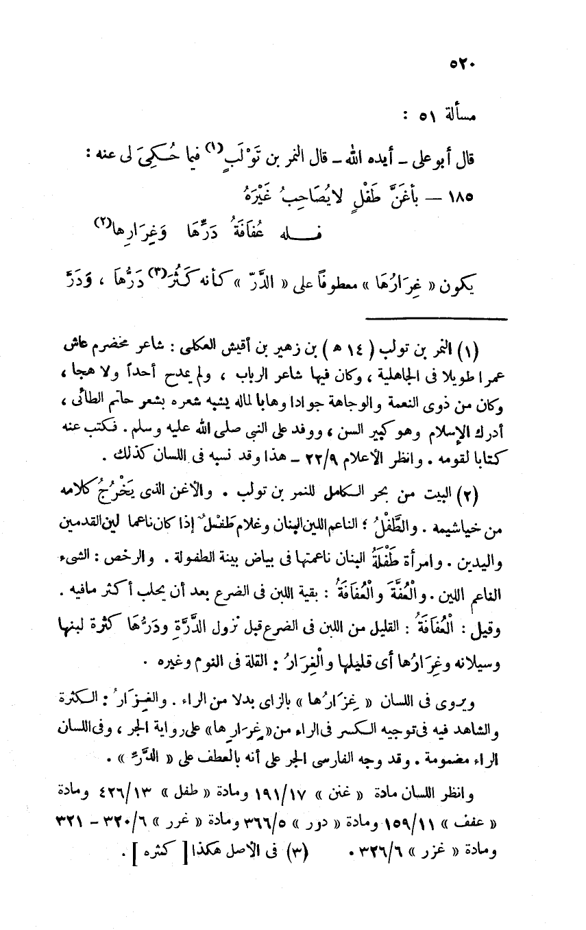 قال أبو علي -أيده الله- قال النمر بن تولبٍ فيما حكى لي عنه: