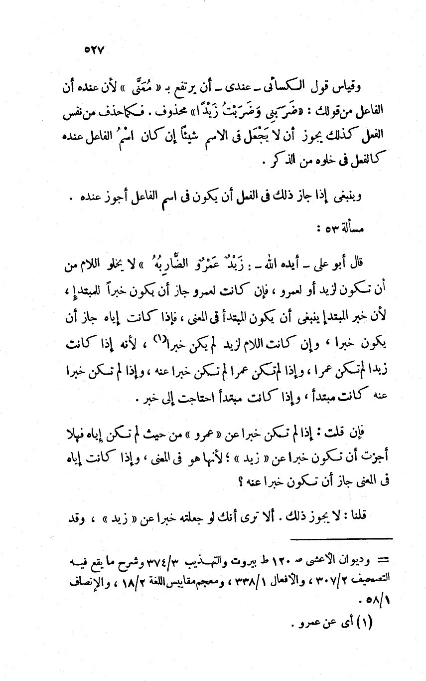 وقياس قول الكسائي -عندي- أن يرتفع بـ "معنى" لأن عنده أن الفاعل من قولك: "ضربني وضربت زيدًا" محذوف. فكما حذف من نفس الفعل كذلك يجوز أن لا يجعل في الاسم شيئًا إن كان اسم الفاعل عنده كالفعل في خلوه من الذكر.