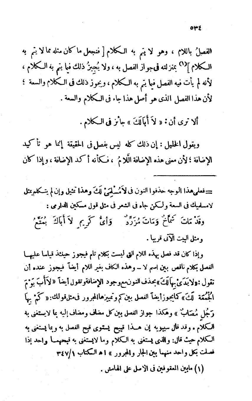 الفصل باللام، وهو لا يتم به الكلام [فنجعل ما كان مثله مما لا يتم به الكلام] بمنزلته في جواز الفصل به، ولا يجيز ذلك فيما يتم به الكلام، لأنه لم يأت فيه الفصل فيما يتم به الكلام، ويجوز ذلك في الكلام والسعة؛ لأن هذا الفصل الذي هو أصل هذا جاء في الكلام والسعة.