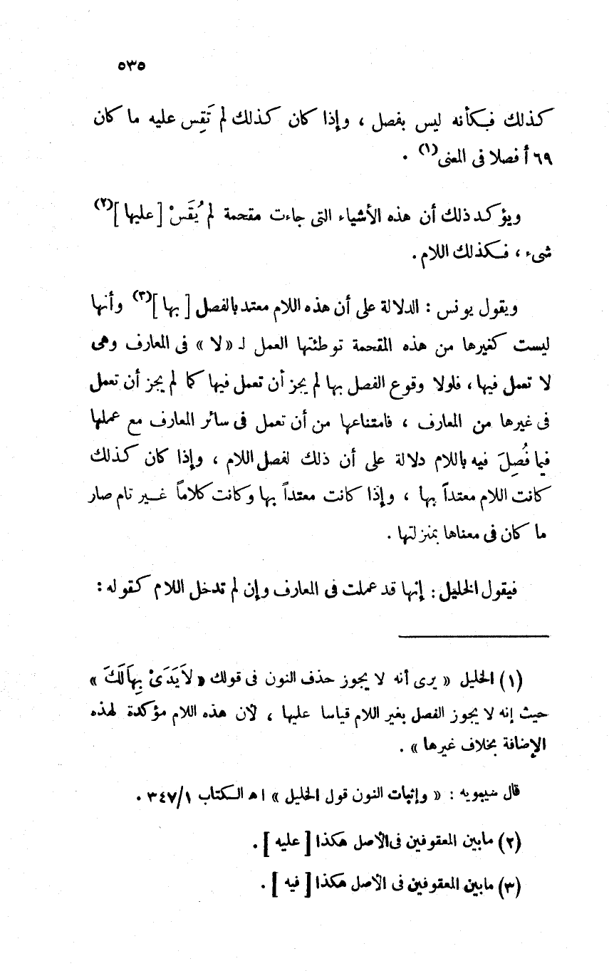 ويقول يونس: الدلالة على أن هذه اللام معتد بالفصل [بها] وأنها ليست كغيرها من هذه المقحمة توطئها العمل لـ "لا" في المعارف وهي لا تعمل فيها، فلولا وقوع الفصل بها لم يجز أن تعمل فيها كما لم يجز أن تعمل في غيرها من المعارف، فامتناعها من أن تعمل في سائر المعارف مع عملها فما فصل فيه باللام دلالة على أن ذلك لفصل اللام، وإذا كان كذلك كانت اللام معتدًا بها، وإذا كانت معتدًا بها وكانت كلامًا غير تام صار ما كان في معناها بمنزلتها.