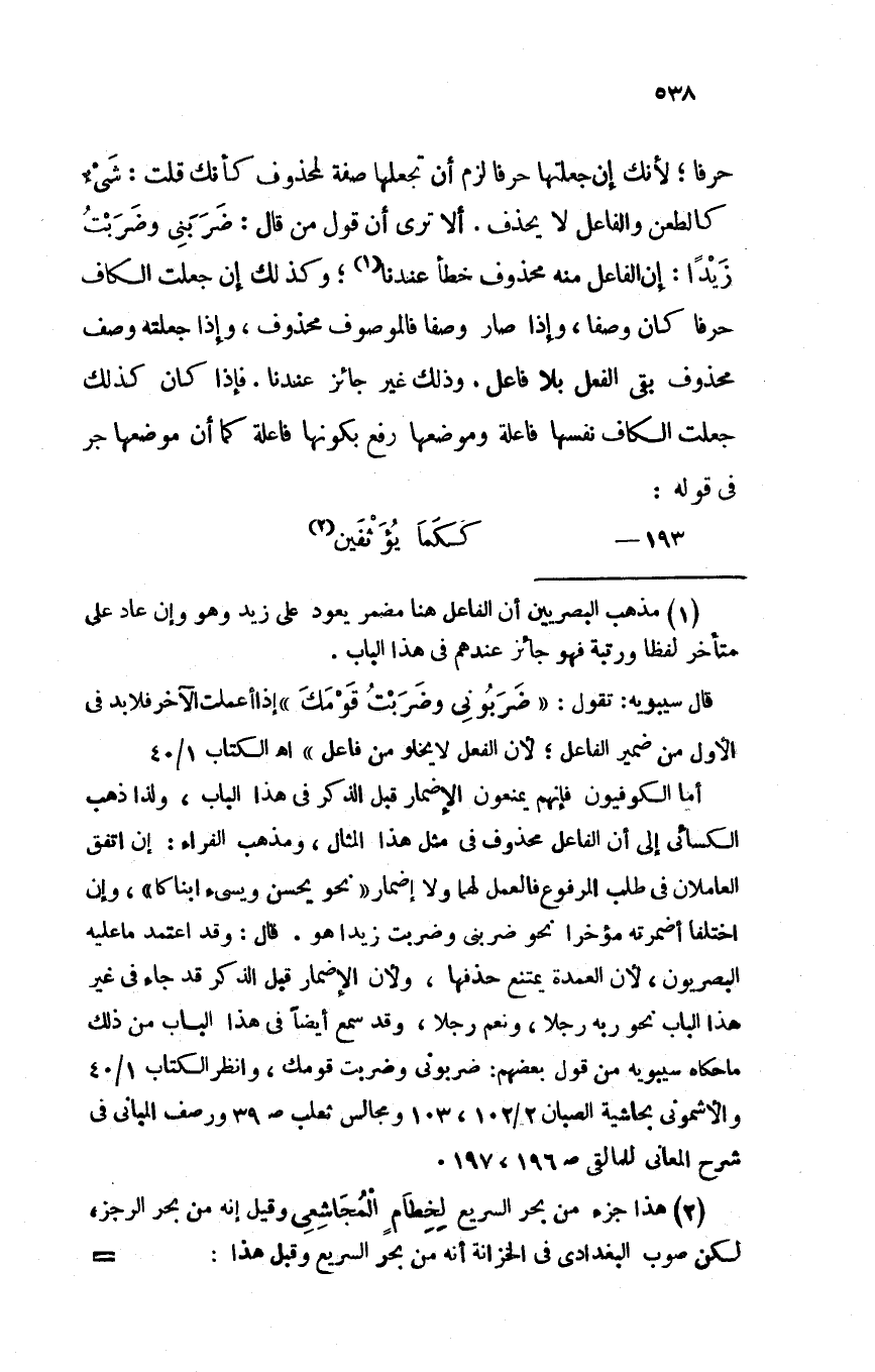 حرفًا؛ لأنك إن جعلتها حرفًا لزم أن تجعلها صفة لمحذوف كأنك قلت: شيء كالطعن والفاعل لا يحذف. ألا ترى أن قول من قال: ضربني وضربت زيدًا: إن الفاعل منه محذوف خطأ عندنا؛ وكذلك إن جعلت الكاف حرفا كان وصفًا، وإذا صار وصفًا فالموصوف محذوف، وإذا جعلته وصف محذوف بقى الفعل بلا فاعل، وذلك غير جائز عندنا. فإذا كان كذلك جعلت الكاف نفسها فاعلة وموضعها رفع بكونها فاعلة كما أن موضعها جر في قوله: