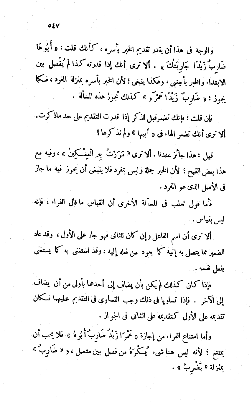 وأما امتناع الفراء من إجازة "عمرًا زيد ضارب أبوه" فلا يجب أن يمتنع؛ لأنه ليس هنا شيء يكره من فصل بين متصل، و"ضارب" بمنزلة "يضرب".