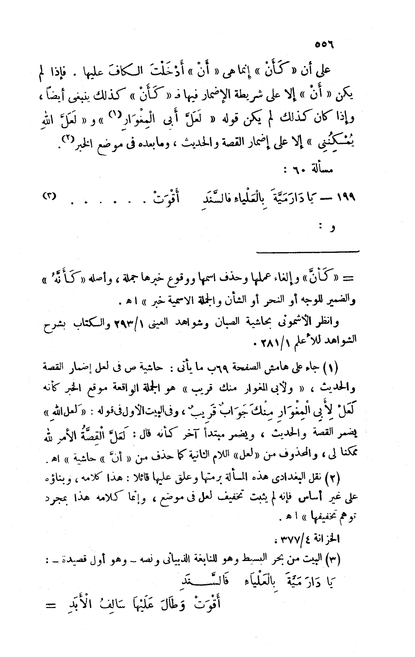 على أن "كأن" إنما هي "أن" أدخلت الكاف عليها. فإذا لم يكن "أن" إلا على شريطة الإضمار فيها فـ "كأن" كذلك ينبغي أيضًا، وإذا كان كذلك لم يكن قوله "لعل أبي المغوار" و"لعل الله يمكنني" إلا على إضمار القصة والحديث، وما بعده في موضع الخبر.