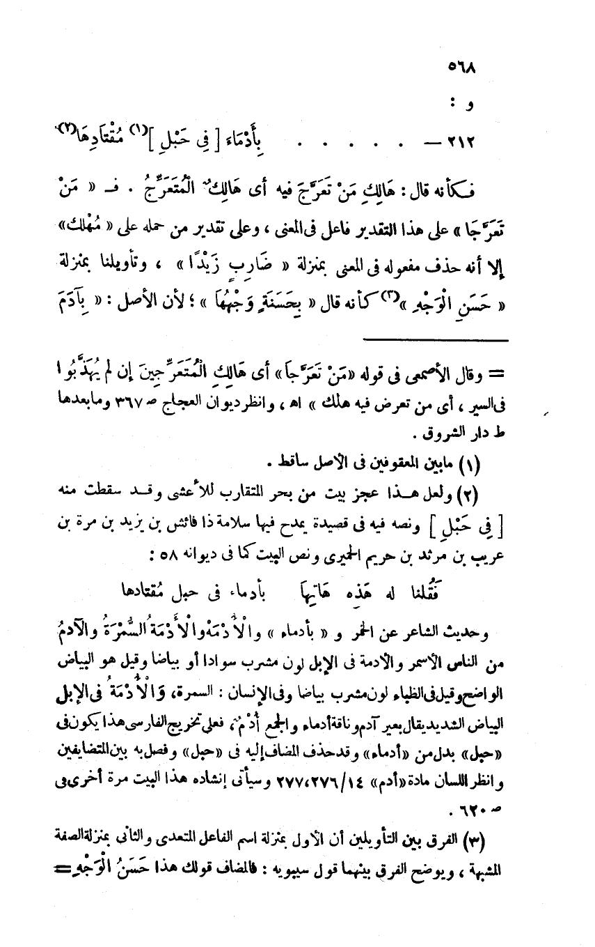فكأنه قال: هالك من تعرج فيه أي هالك المتعرج. فـ "من تعرجا" على هذا التقدير فاعل في المعنى، وعلى تقدير من حمله على "مهلك" إلا أنه حذف مفعوله في المعنى بمنزلة "ضارب زيدًا"، وتأويلنا بمنزلة "حسن الوجه" كأنه قال "بحسنةٍ وجهها"؛ لأن الأصل: "بآدم