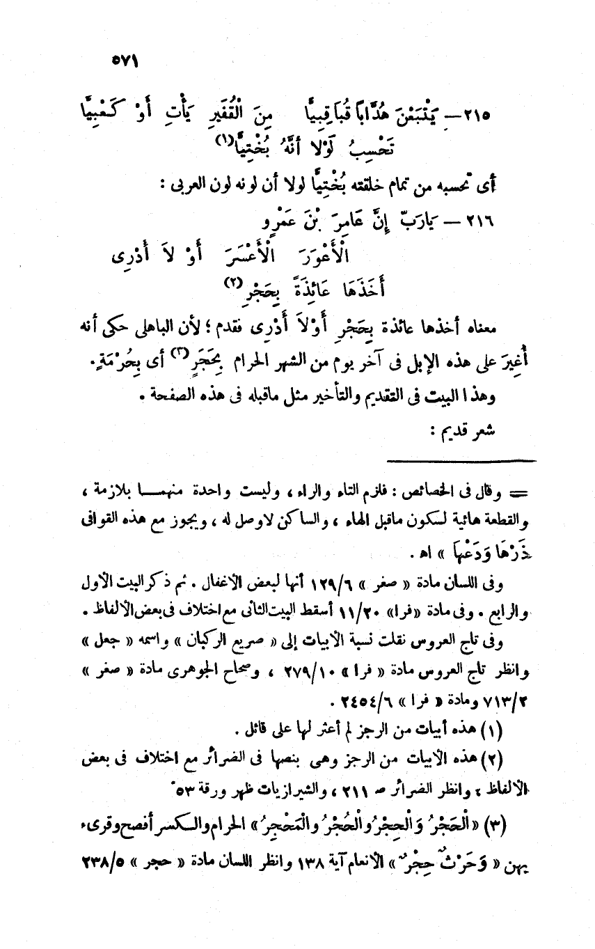 معناه أخذها عائذة بحجر أولا أدري فقدم؛ لأن الباهلي حكى أنه أغير على هذه الإبل في آخر يوم من الشهر الحرام بحجرٍ أي بحرمةٍ.