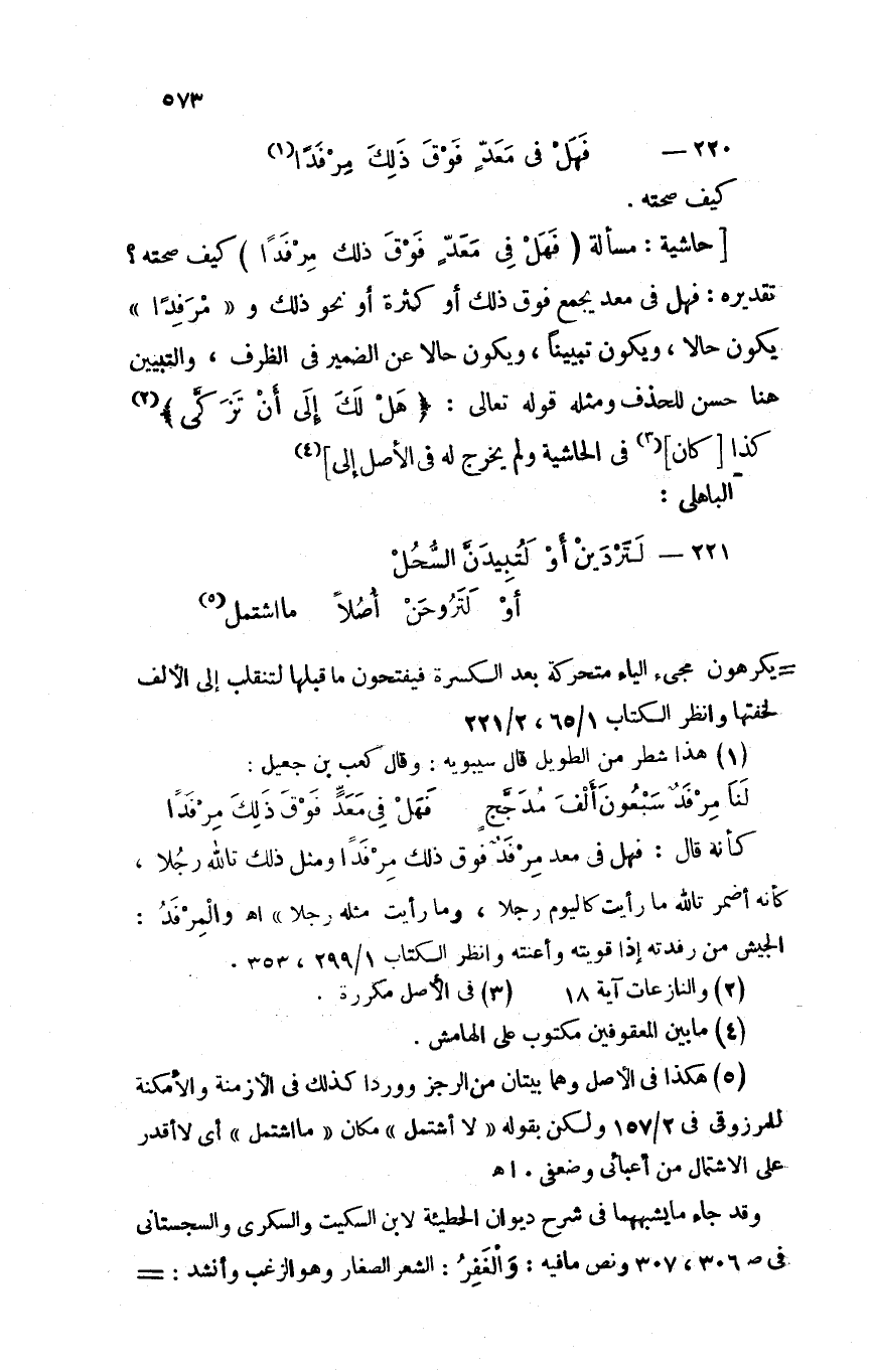 [حاشية: مسألة (فهل في معدٍ فوق ذلك مرفدًا) كيف صحته؟ تقديره: فهل في معد يجمع فوق ذلك أو كثرة أو نحو ذلك و"مرفدًا" يكون حالا، ويكون تبيينًا، ويكون حالاً عن الضمير في الظرف، والتبيين هنا حسن للحذف ومثله قوله تعالى: (هل لك إلى أن تزكى) كذا [كان] في الحاشية ولم يخرج له في الأصل إلى]