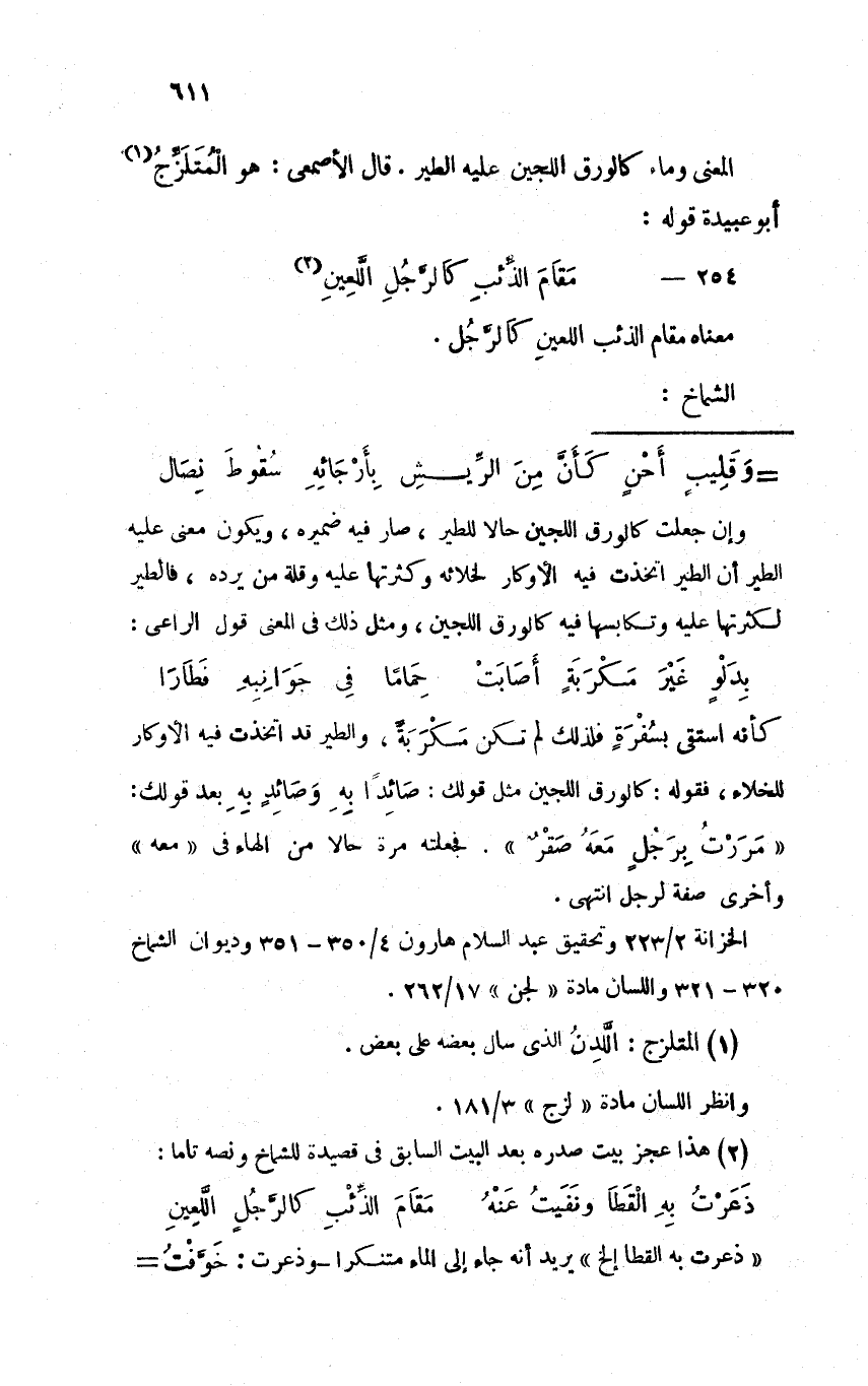 المعنى وماء كالورق اللجين عليه الطير. قال الأصمعي: هو المُتلزج أبو عبيدة قوله: