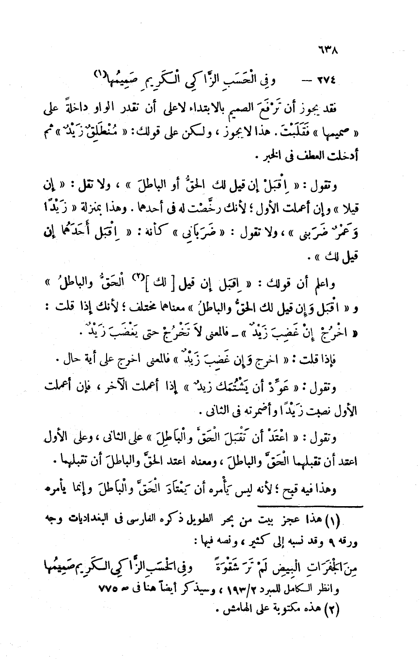 وتقول: "اعتدْ أن تقبل الحق والباطل" على الثاني، وعلى الأول اعتد أن تقبلهما الحق والباطل، ومعناه اعتد الحق والباطل أن تقبلهما.