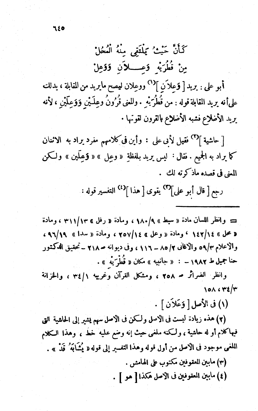 [حاشية] فقيل لأبي علي: وأين في كلامهم مفرد يراد به الإثنان كما يراد به الجميع. فقال: ليس يريد بلفظةِ "وعِل" "وَعِلَين" ولكن المعنى في قصده ما ذكرته لك.