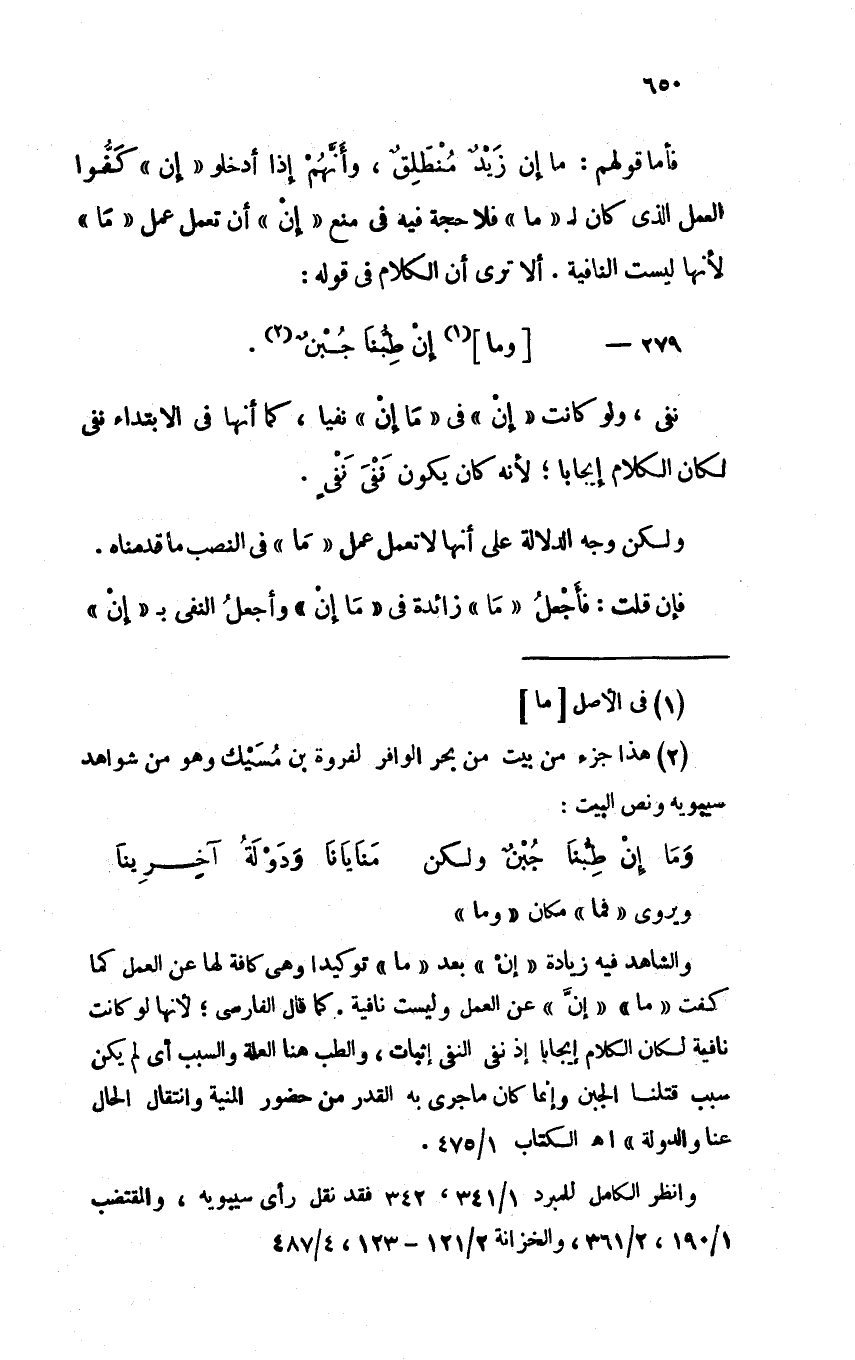 فأما قولهم: ما إن زيدٌ منطلقٌ، وأنهم إذا أدخلوا "إن" كفوا العمل الذي كان لـ "ما" فلا حجة فيه في منع "إنْ" أن تعمل عمل "مَا" لأنها ليست النافية. ألا ترى أن الكلام في قوله: