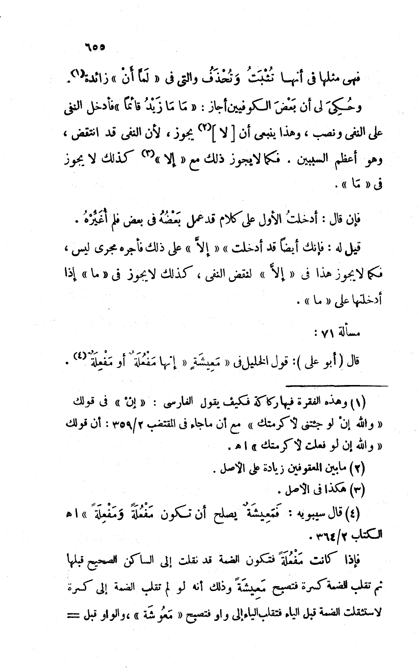قال (أبو علي): قول الخليل في "معيشةٍ" إنها مَفْعُلةٌ أو مَفْعِلةٌ.