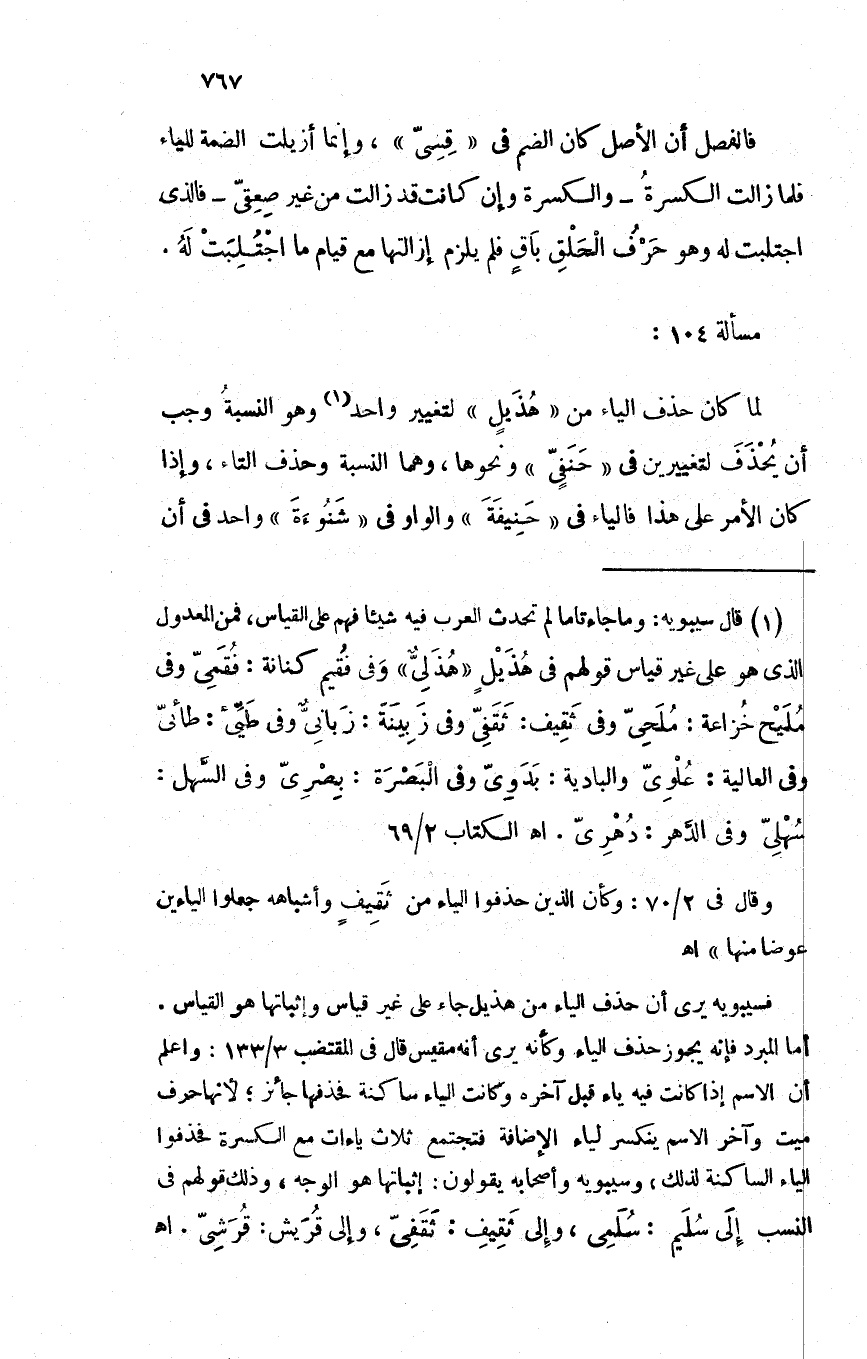 لما كان حذف الياء من "هُذَيلٍ" لتغيير واحد وهو النسبةُ وجب أن يُحْذَفَ لتغييرين في "حنَفِيّ" ونحوها، وهما النسبة وحذف التاء، وإذا كان الأمر على هذا فالياء في "حَنِيفَةَ" والواو في "شَنُوءَةَ" واحد في أن