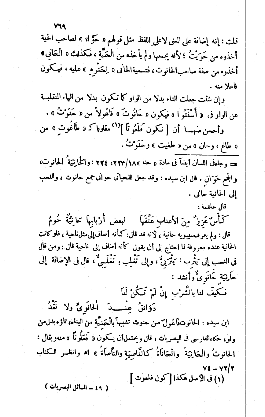 قلت: إنه إضافة على المعنى ل على اللفظ مثل قولهم "حوَّاه" لصاحب الحية أخذوه من حَوَيْتُ؛ لأنه يجمعها ولم يأخذه من الحَيَّةِ، فكذلك "الْحَانِي" أخذوه من صفة صاحب الحانوت، فتسمية الحاني "لِحَنْوِهِ" عليه، فيكون فاعلاً منه.