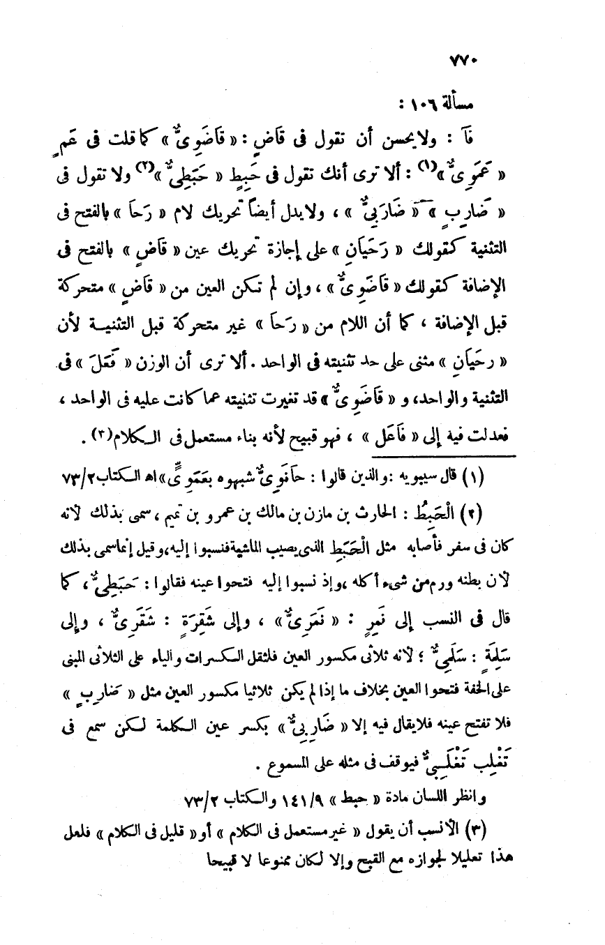 فآ: ولا يحسن أن تقول في قاضٍ: "قاضَوِيٌّ" كما قلت في عمٍ "عمَوِيٌّ": ألا ترى أنك تقول في حبطٍ "حبَطِيٌّ" ولا تقول في "ضاربٍ" "ضاربيٌّ"، ولا يدل أيضاً تحريك لام "رحَا" بالفتح في التثنية كقولك "رحيَانِ" على إجازة تحريك عين "قاضٍ" بالفتح في الإضافة كقولك "قاضَوِيٌّ"، وإن لم تكن العين من "قاضٍ" متحركة قبل الإضافة، كما أن اللام من "رحَا" غير متحركة قبل التثنية لأن "رحيانِ" مثنى على حد تثنيته في الواحد. ألا ترى أن الوزن "فَعَلَ" في التثنية والواحد، و"قاَضَوِيٌّ" قد تغيرت تثنيته عما كانت عليه في الواحد، فعدلت فيه إلى "فَاعَل"، فهو قبيح لأنه بناء مستعمل في الكلام.