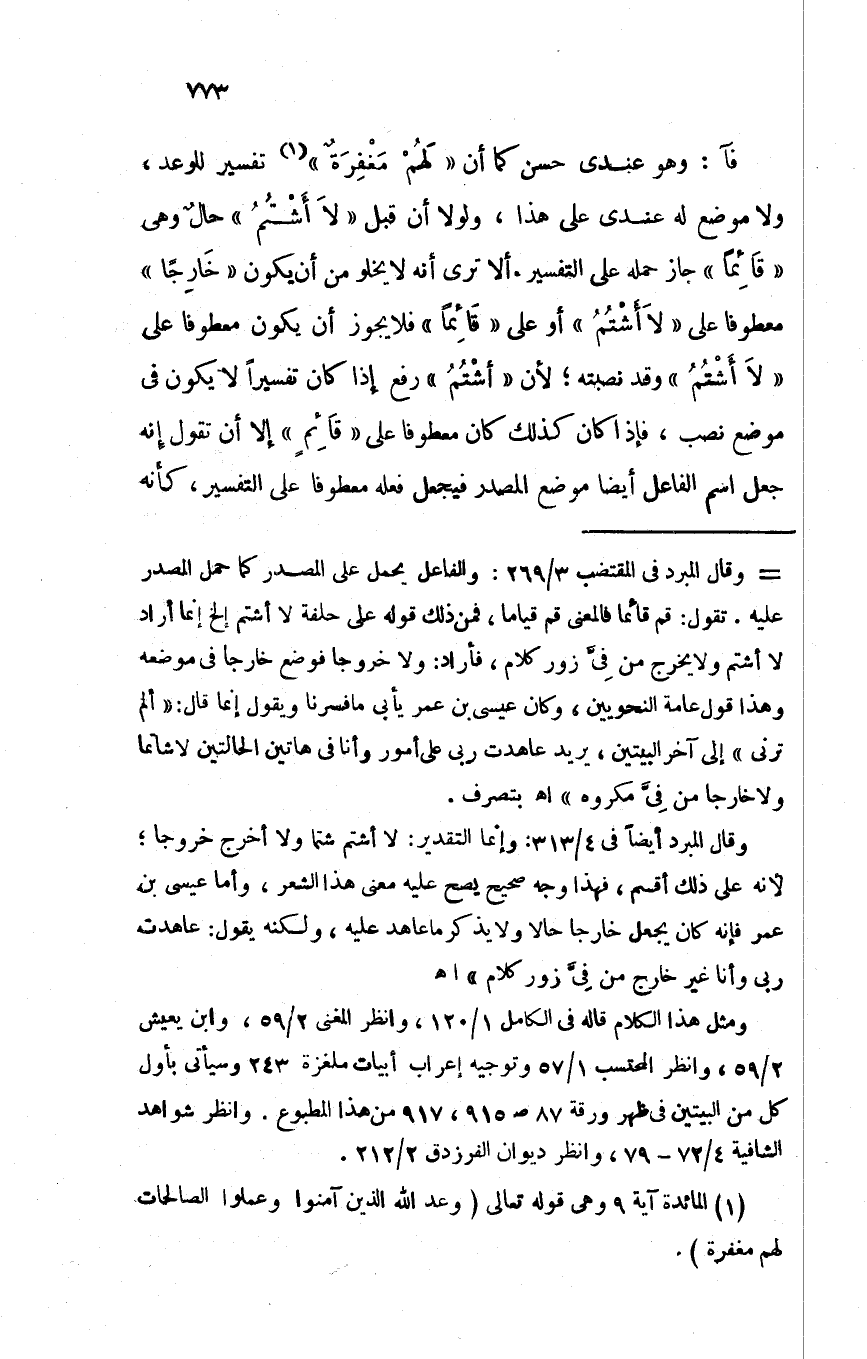 فآ: وهو عندي حسن كما أن "لَهُمْ مغْفِرَةٌ" تفسير للوعد، ولا موضع له عندي على هذا، ولولا أن قبل "لا أشْتُمُ" حالٌ وهي "قائماً" جاز حمله على التفسير. ألا ترى أنه لا يخلو من أن يكون "خارجاً" معطوفاً على "لا أشْتُمُ" أو على "قائماً" فلا يجوز أن يكون معطوفاً على "لا أشْتُمُ" وقد نصبته؛ لأن "أشْتُمُ" رفع إذا كان تفسيراً لا يكون في موضع نصب، فإذا كان كذلك كان معطوفاً على "قائمٍ" إلا أن تقول إنه جعل اسم الفاعل أيضاً موضع المصدر فيجعل فعله معطوفاً على التفسير، كأنه