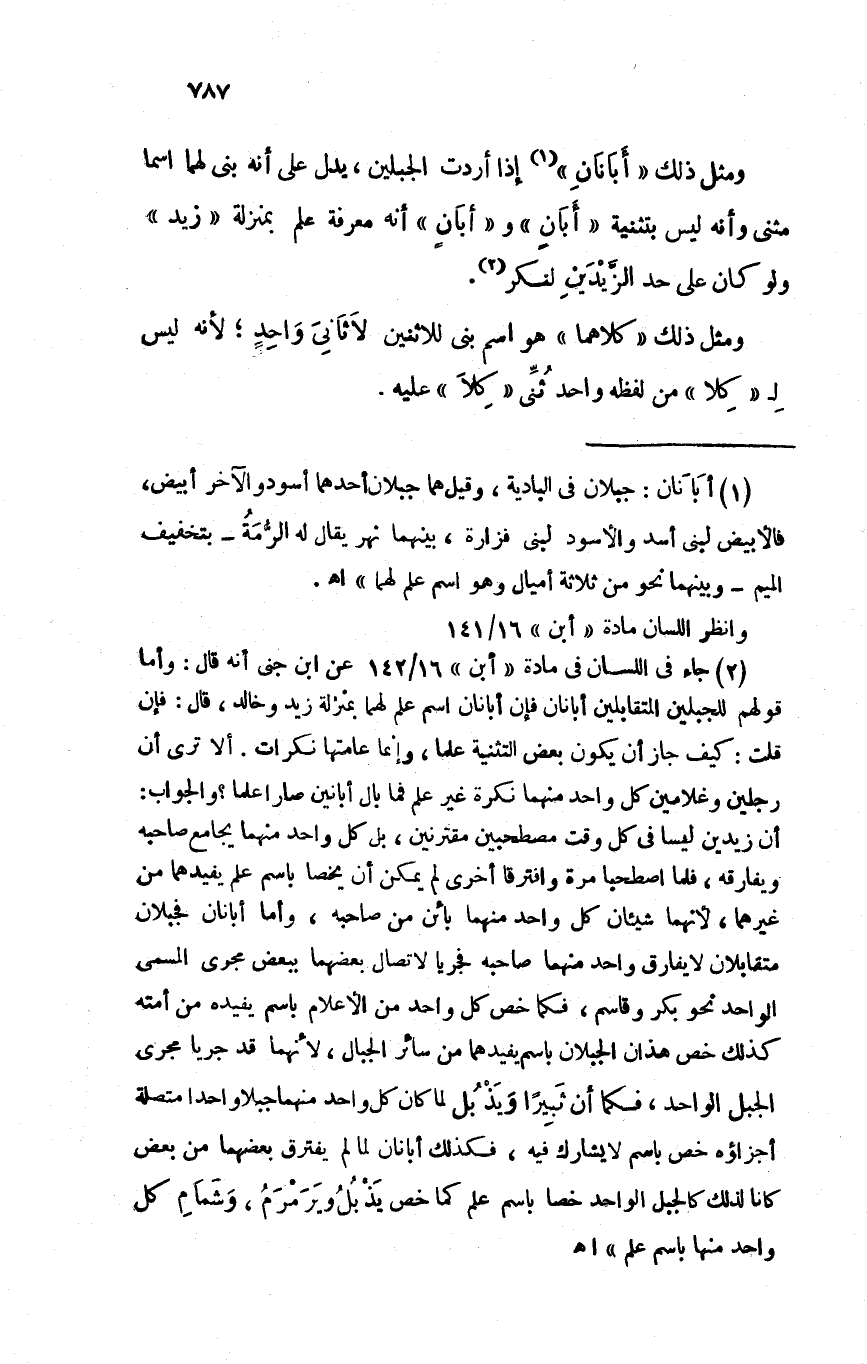 ومثل ذلك "أبانانِ" إذا أردت الجبلين، يدل على أنه بنى لهما اسما مثنى وأنه ليس بتثنية "أبانٍ" و"أبانٍ" أنه معرفة علم بمنزلة "زيد" ولو كان على حد الزيدين لنكر.