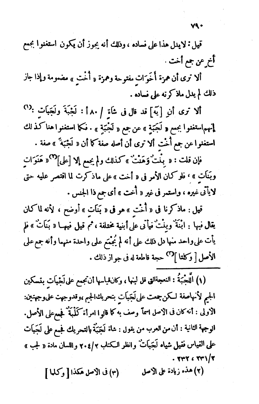 ألا ترى أن [يه] قد قال في شاةٍ /80 أ: لَجْبَةَ ولجباتٍ: إنهم استغنوا بجمع "لجبةٍ" عن جمع "لَجْبَةٍ". فكما استغنوا هنا كذلك استغنوا عن جمع أختٍ ألا ترى أن أصله صفة كما أن "لجْبَةً" صفة.