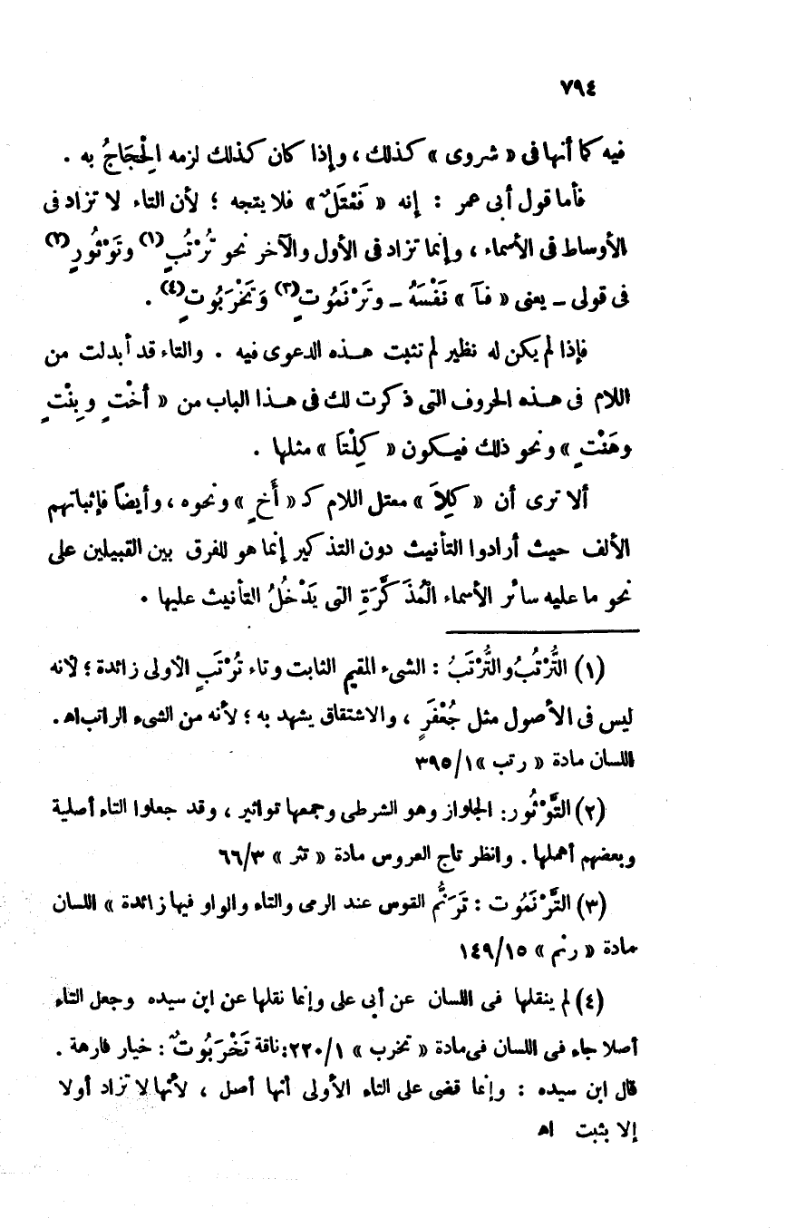فأما قول أبي عمر: إنه "فَعْتَلٌ" فلا يتجه؛ لأن التاء لا تزاد في الأوساط في الأسماء، وإنما تزاد في الأول والآخر نحو تُرْتُبٍ وتَوْثُورٍ في قولي - يعني "فآ" نفسَهُ - وترْنَمُوتٍ وتَخْرَبُوتٍ.