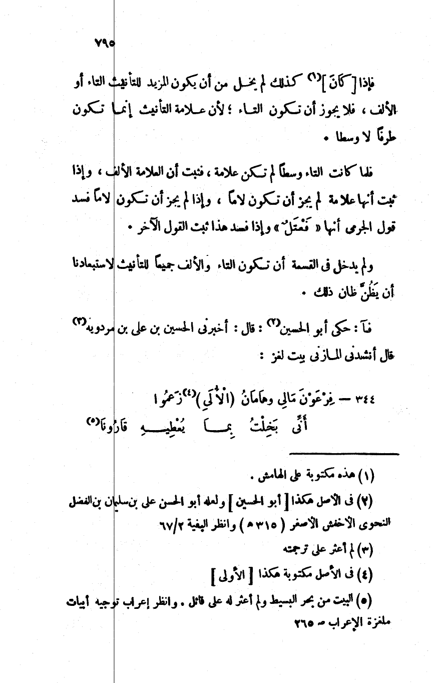 فآ: حكى أبو الحسين: قال: أخبرني الحسين بن علي بن مردويه قال أنشدني المازني بيت لغز: