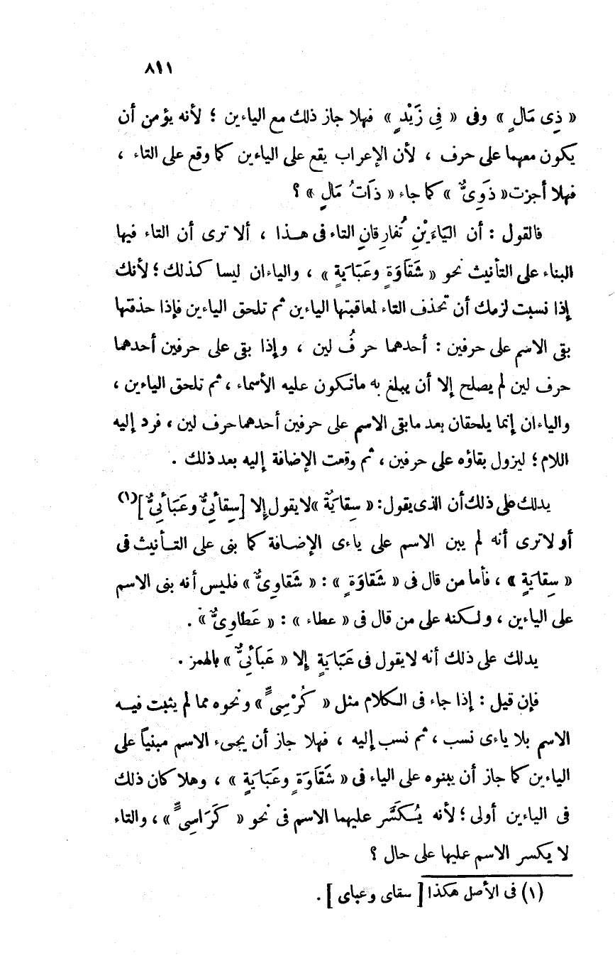 بذلك على ذلك أن الذي يقول: "سقايةٌ" لا يقول إلا [سقائي وعبائيٌّ] أو لا ترى أنه لم يبن الاسم على ياءي الإضافة كما بنى على التأنيث في "سقايةٍ"، فأما من قال في "شقاوةٍ": "شقاويٌّ" فليس أنه بنى الاسم على الياءين، ولكنه على من قال في "عطاء": "عطاويٌّ".