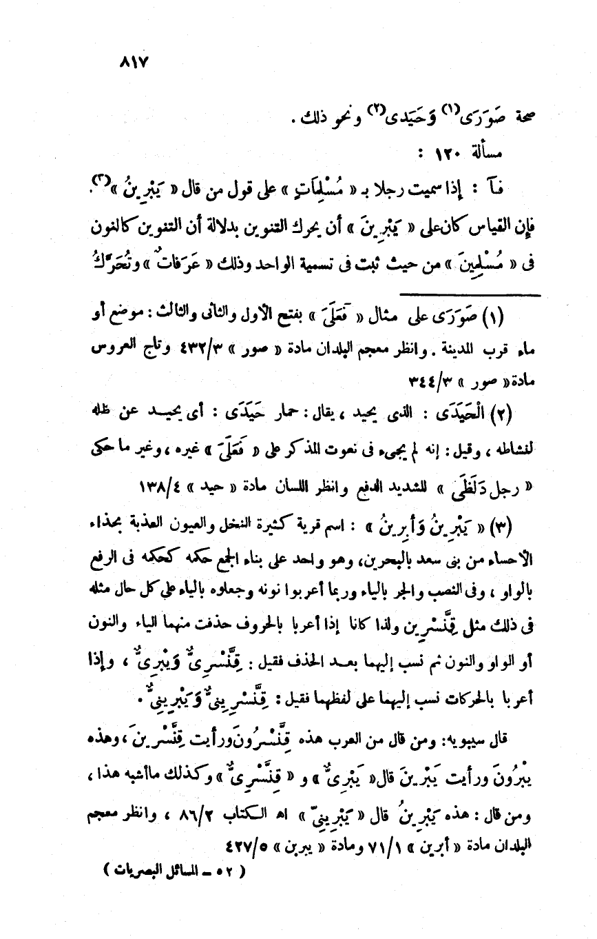 فآ: إذا سميت رجلاً بـ "مُسْلِمَاتٍ" على قول من قال "يبْرِينُ". فإن القياس كان على "يَبْرِينَ" أن يحرك التنوين بدلالة أن التنوين كالنون في "مُسْلِمِينَ" من حيث ثبت في تسمية الواحد وذلك "عرفاتٌ" وتُحَرِّكُ