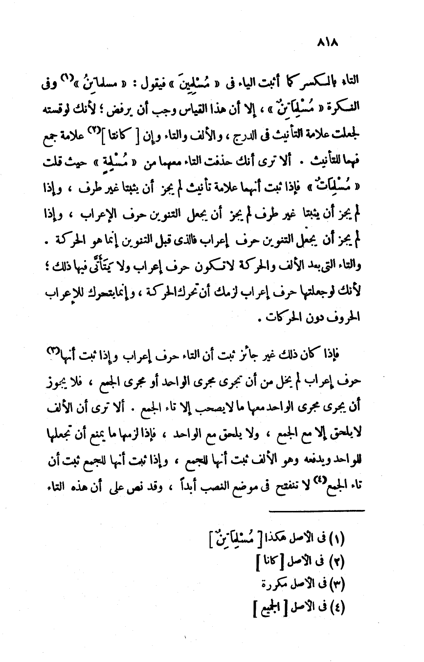 التاء بالكسر كما أثبت الياء في "مُسْلِمِينَ" فيقول: "مسلماتِنُ" وفي النكرة "مُسْلِمَاتِنٌ"، إلا أن هذا القياس وجب أن يرفض؛ لأنك لو قسته لجعلت علامة التأنيث في الدرج، والألف والتاء وإن [كانتا] علامة جمع فهما للتأنيث. ألا ترى أنك حذفت التاء معهما من "مُسْلِمةٍ" حيث قلت "مُسْلِمَاتٌ" فإذا ثبت أنهما علامة تأنيث لم يجز أن يثبتا غير طرف، وإذا لم يجز أن يثبتا غير طرف لم يجز أن يجعل التنوين حرف الإعراب، وإذا لم يجز أن يجعل التنوين حرف إعراب فالذي قبل التنوين إنما هو الحركة. والتاء التي بعد الألف والحركة لا تكون حرف إعراب ولا يتأتى فيها ذلك؛ لأنك لو جعلتها حرف إعراب لزمك أن تحرك الحركة، وإما يتحرك للإعراب الحروف دون الحركات.