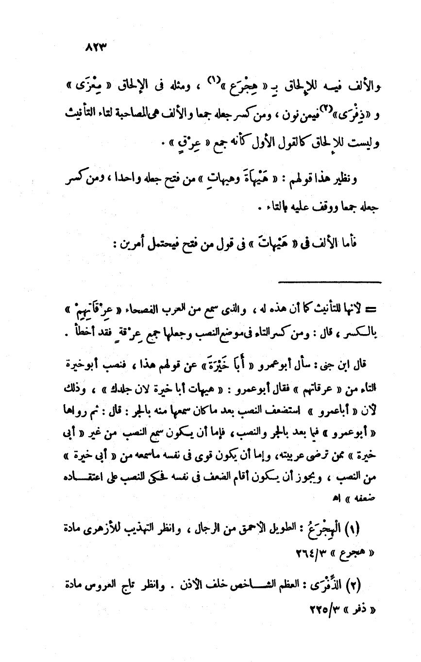 ونظير هذا قولهم: "هيهاةَ وهيهاتٍ" من فتح جعله واحداً، ومن كسر جعله جمعاً ووقف عليه بالتاء.