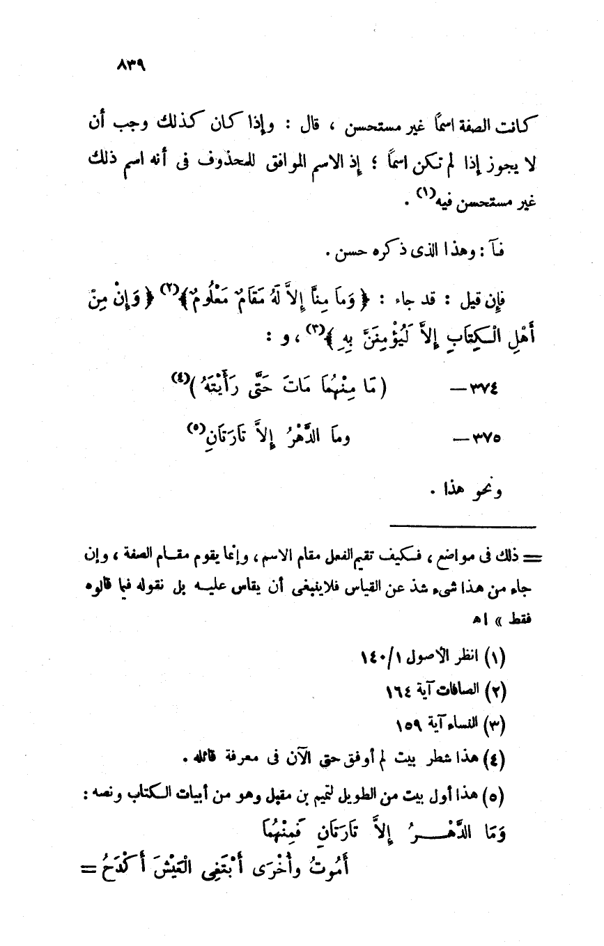 كانت الصفة اسماً غير مستحسن، قال: وإذا كان كذلك وجب أن لا يجوز إذا لم تكن اسماً؛ إذ الاسم الموافق للمحذوف في أنه اسم ذلك غير مستحسن فيه.